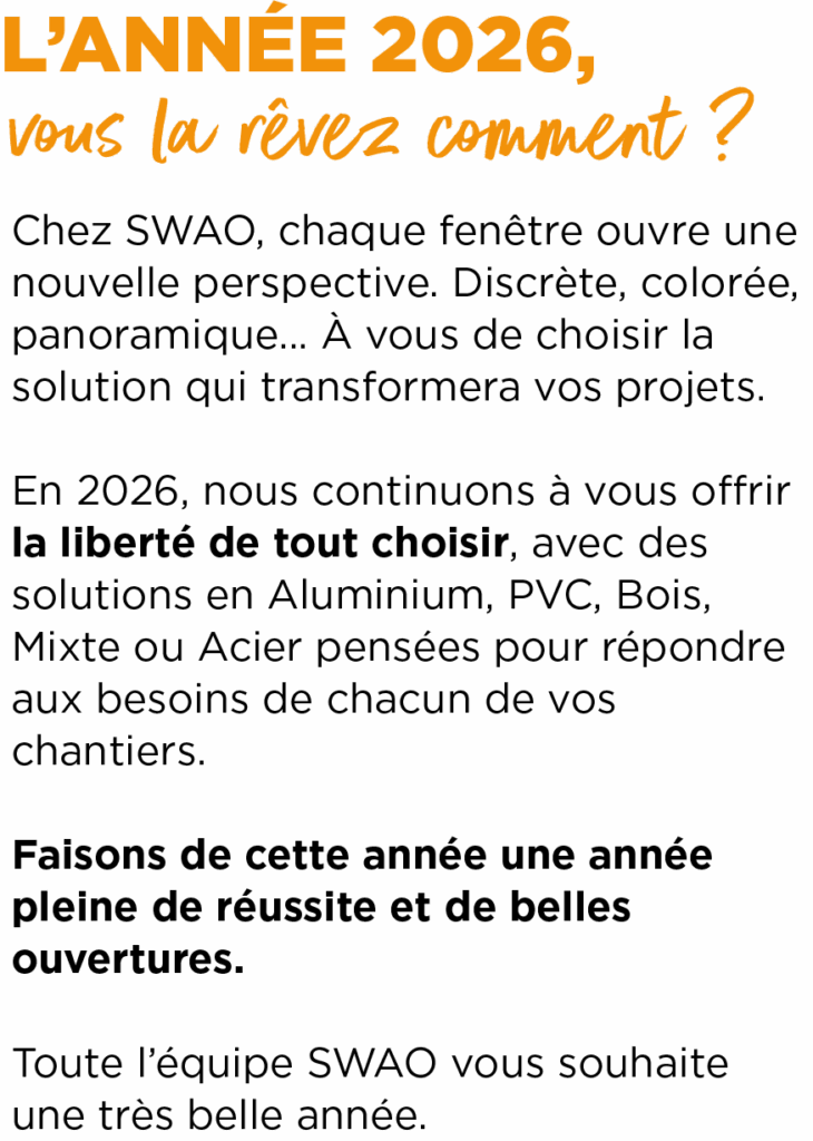 Chez SWAO, nous croyons que chaque projet est unique. En 2026, continuons à construire ensemble des espaces qui vous ressemblent.
